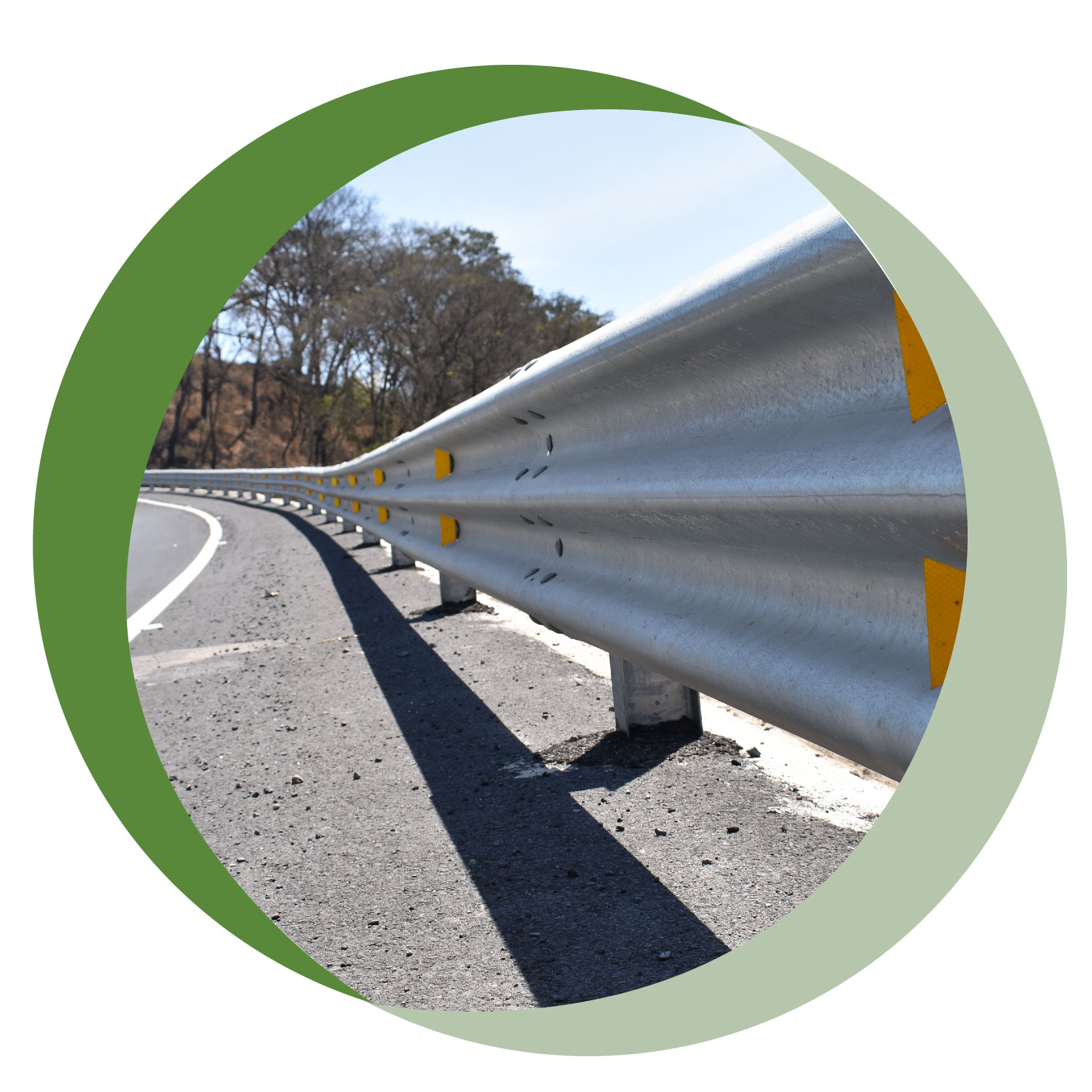Los calibres utilizados son de 12 y 10 en 3.81 ó 7.62 metros de largo. La defensa incluye las terminales en calibre 12 que sean necesarias y un cuadrado reflejante para mayor seguridad vial. Galvanizado por inmersión.